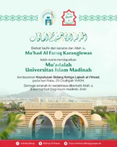 Alhamdulillahi wahdah! Dengan semua kesederhanaan dan kesahajaan yang ada di Ma’had Al Faruq Karanglewas Purwokerto, tahun ini kami memperoleh amanah dan kehormatan baru; dengan diterima Muadalah/Akreditasi dari Universitas Islam Madinah Saudy Arabia. Setealh melalui proses panjang seperti kami beritakan sebelumnya…